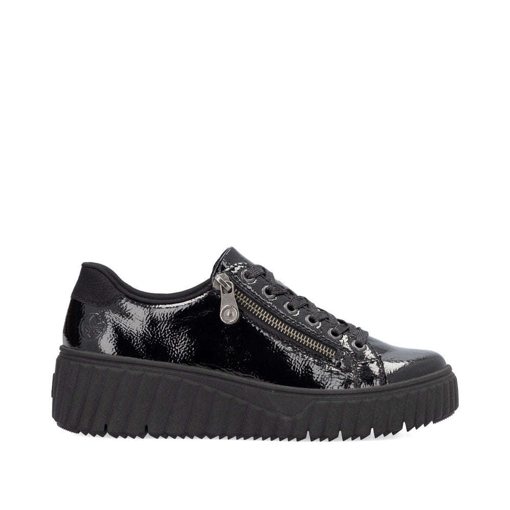 Confort et style se marient parfaitement. Ces baskets basses noires Rieker en cuir verni séduisent par leur design moderne et leur confort optimal. L'association astucieuse du laçage et de la fermeture éclair facilite l'enfilage et le retrait. La semelle plateforme, légère et adhérente, assure une excellente adhérence. Grâce à leur semelle intérieure rembourrée et amovible, ces baskets offrent un confort optimal. Tout simplement génial !