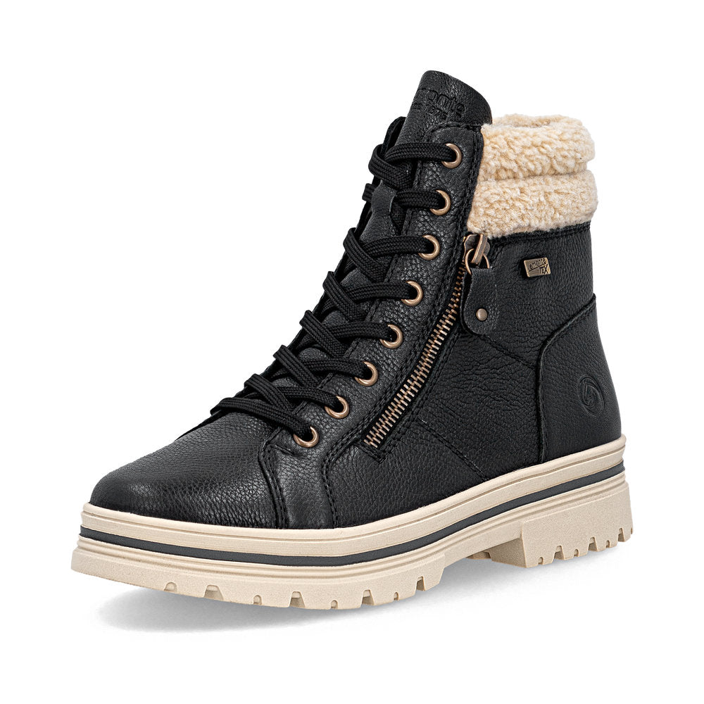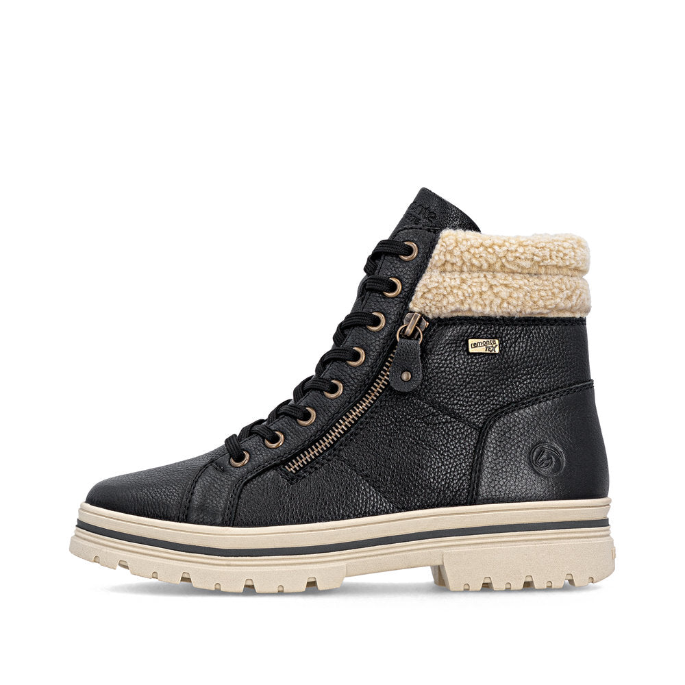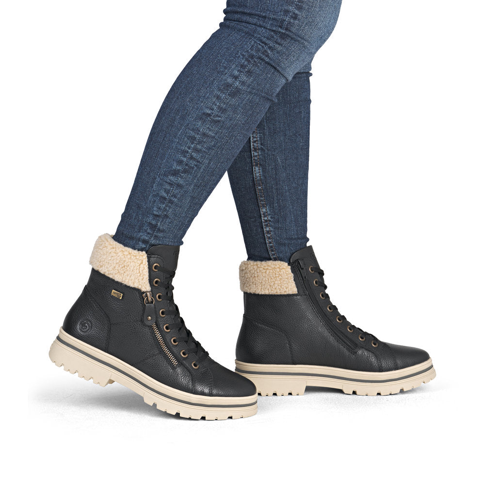Les pieds froids n'ont aucune chance ! Ces bottines à lacets Remonte noires et beiges en cuir lisse vous accompagneront tout au long de la saison avec style et confort. L'association astucieuse du laçage et de la fermeture éclair offre un maintien optimal et facilite l'enfilage et le retrait. Le col en fourrure sur la tige attire tous les regards. La semelle adhérente et légère assure une bonne adhérence à chaque pas. La largeur confort offre une plus grande liberté de mouvement aux orteils. La tige déperlante protège de l'humidité et du vent, tandis que la semelle intérieure à effet thermique maintient la chaleur à l'intérieur de la chaussure. La laine vierge douillette et très chaude garde les pieds au chaud. Fidèle à la devise : le confort rencontre le style !