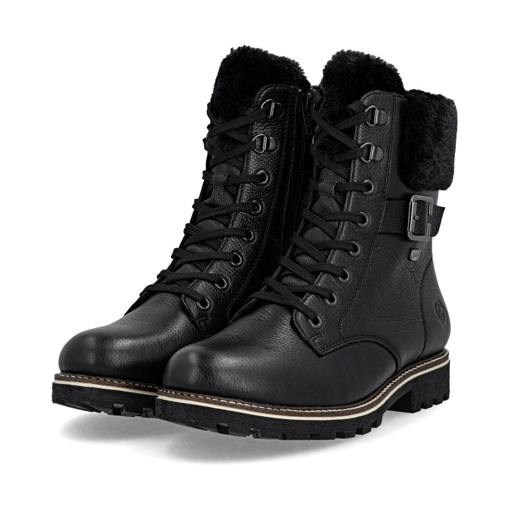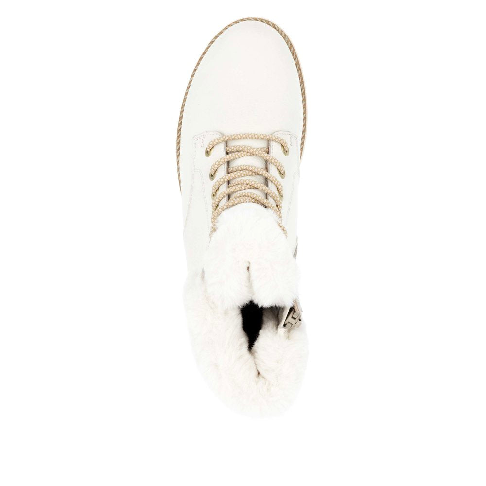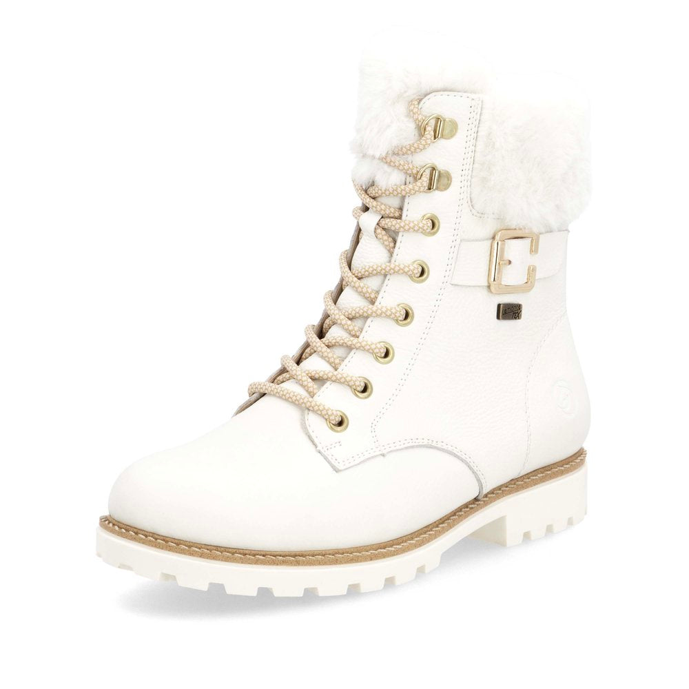 Les journées froides deviennent chaudes ! Ces bottines blanches Remonte à lacets en cuir lisse sont un véritable accroche-regard ! L'association astucieuse du laçage et de la fermeture éclair facilite l'enfilage et le retrait. Le col de la tige effet peluche est un détail appréciable. La semelle amortissante et flexible assure un bon maintien. La largeur confort offre plus d'espace aux pieds. La surface déperlante offre une protection optimale contre les intempéries et la semelle intérieure thermique protège du froid. Grâce à la fourrure d'agneau agréablement chaude et régulatrice d'humidité, cette chaussure est parfaite pour les températures froides. Difficile de faire plus confortable !