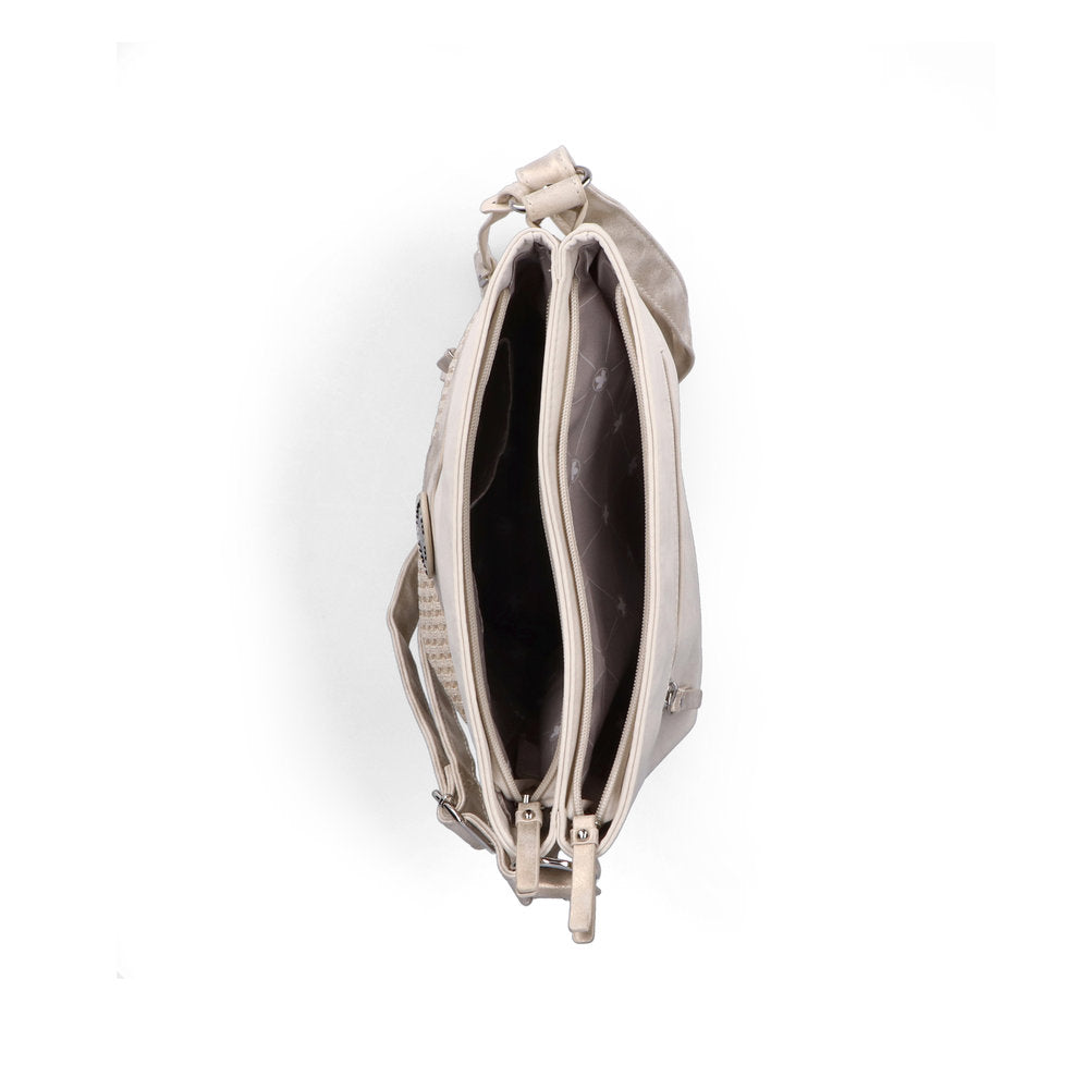 Un mariage de détails tendance ! Le bleu denim associé à un empiècement à rayures verticales à tissage grossier confère à ce sac bandoulière Rieker une allure unique. La rayure bleu clair parsemée de points métalliques brillants y contribue également. La bandoulière ajustable permet un porté croisé. Deux compartiments principaux séparés et des poches extérieures à l'avant et à l'arrière offrent un espace de rangement généreux. À l'intérieur, trois compartiments, dont un zippé et deux ouverts, apportent la touche finale.