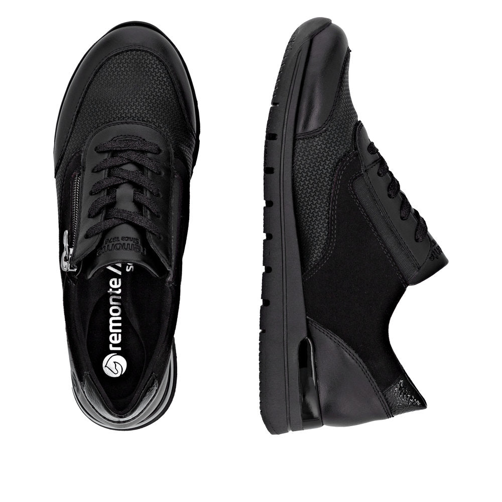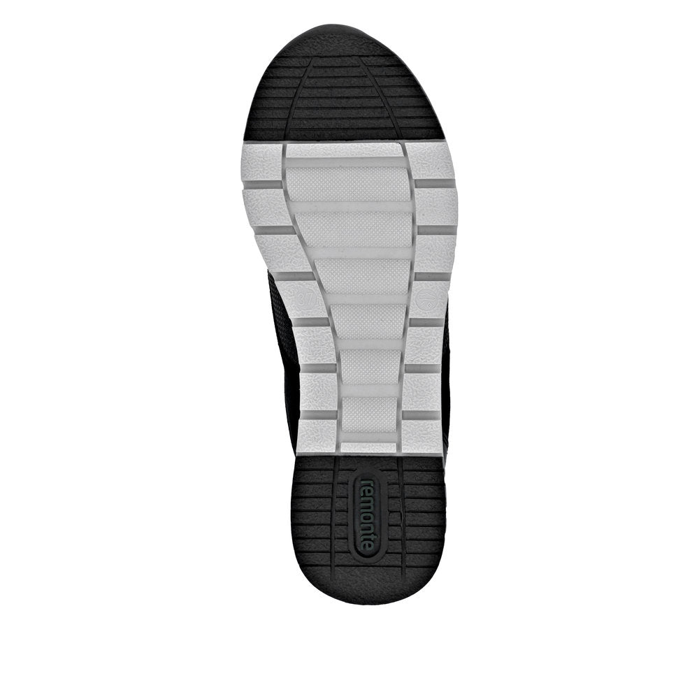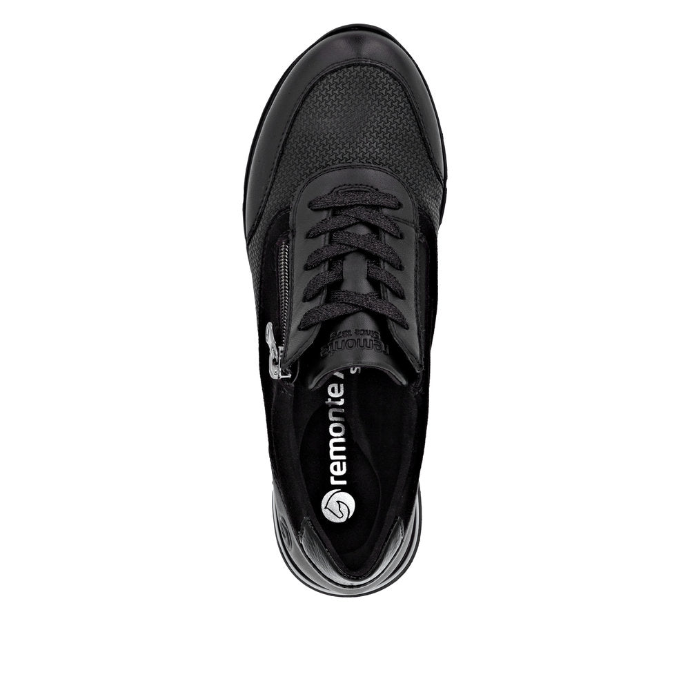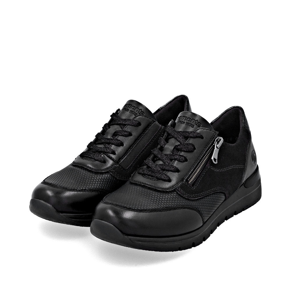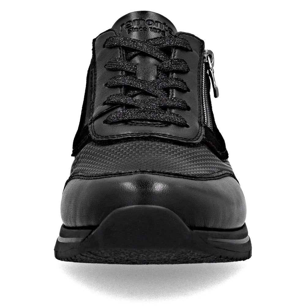 Confort et design : un duo parfait ! Avec ces baskets basses noires Remonte en cuir lisse, vous êtes partout ! Le laçage complète la fermeture éclair et garantit un maintien optimal et un ajustement parfait. La semelle adhérente et légère ainsi que la semelle intérieure rembourrée et amovible offrent un confort optimal. La largeur confort offre plus d'espace aux pieds. La doublure légère en microvelours garantit un confort optimal. Un compagnon idéal pour les beaux jours !