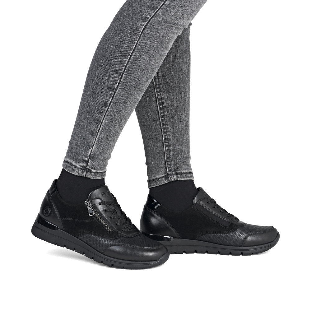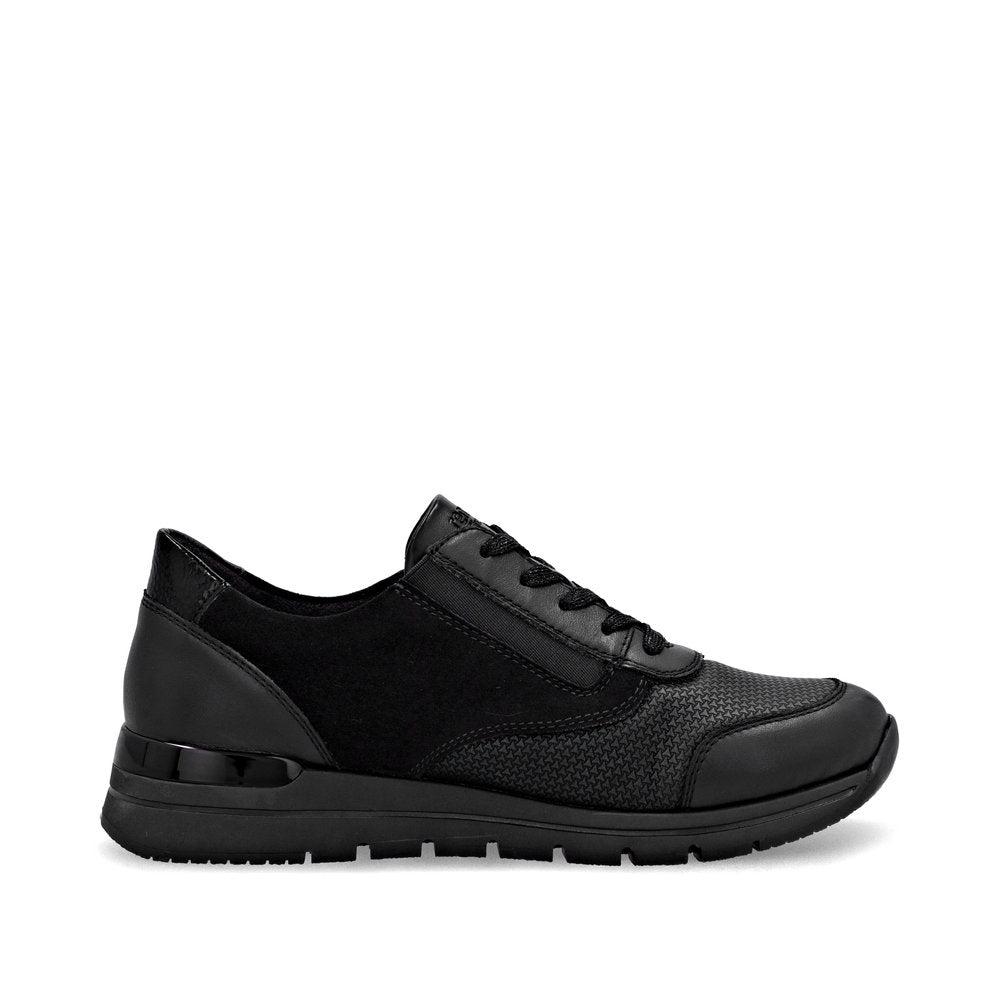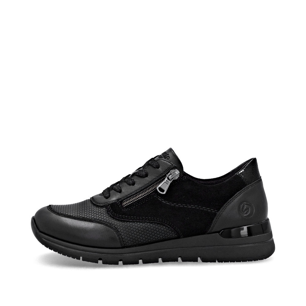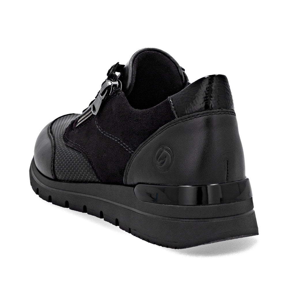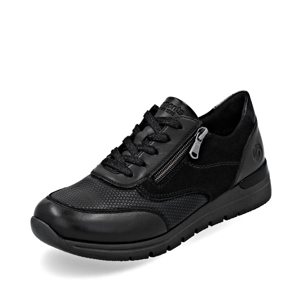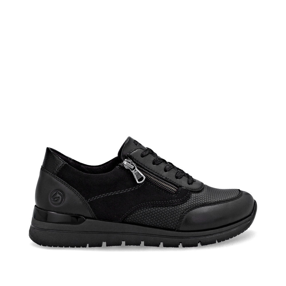 Confort et design : un duo parfait ! Avec ces baskets basses noires Remonte en cuir lisse, vous êtes partout ! Le laçage complète la fermeture éclair et garantit un maintien optimal et un ajustement parfait. La semelle adhérente et légère ainsi que la semelle intérieure rembourrée et amovible offrent un confort optimal. La largeur confort offre plus d'espace aux pieds. La doublure légère en microvelours garantit un confort optimal. Un compagnon idéal pour les beaux jours !