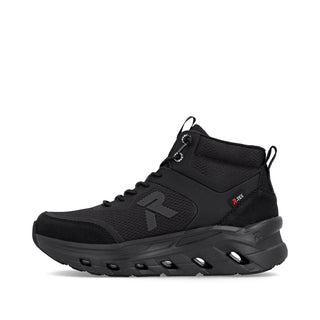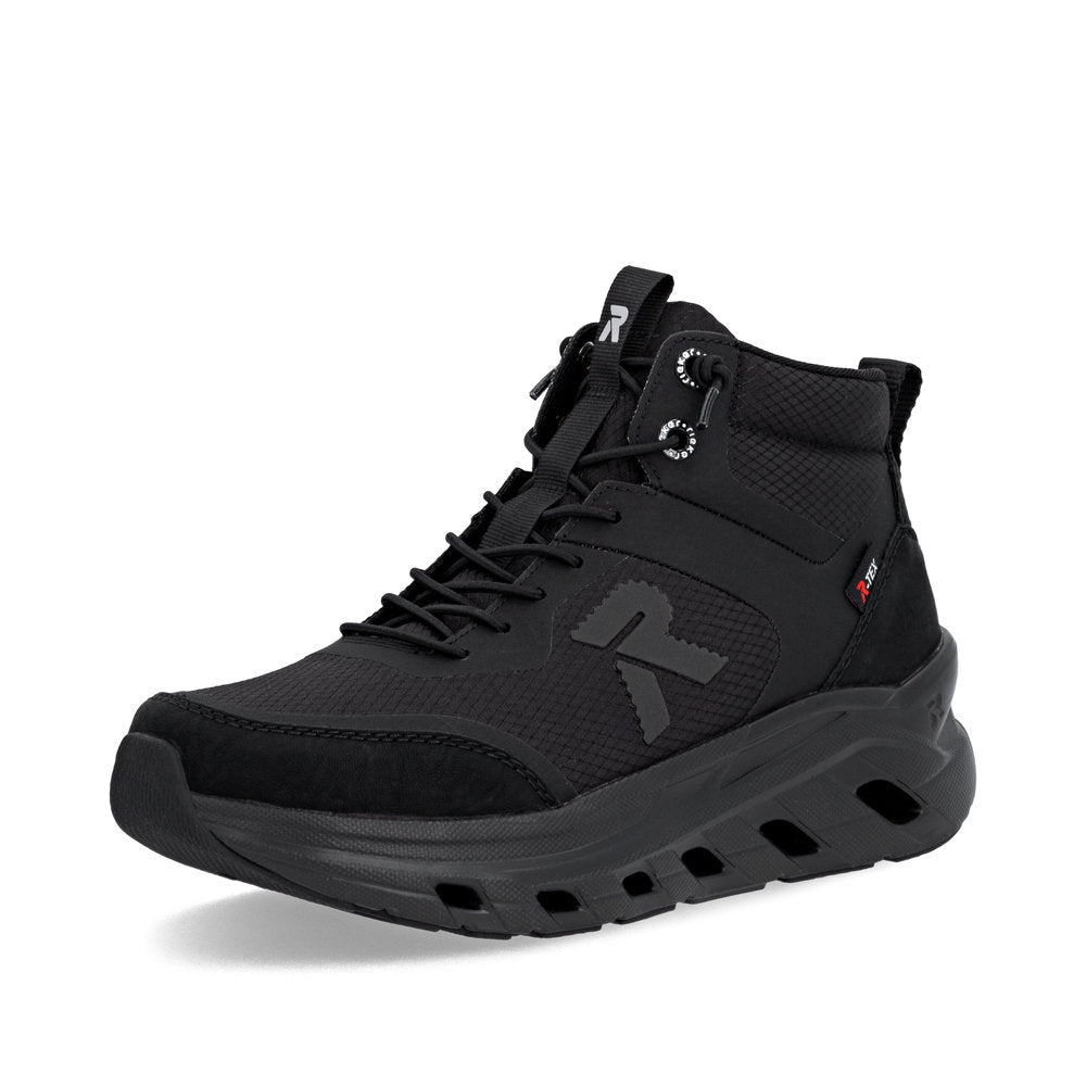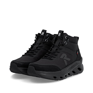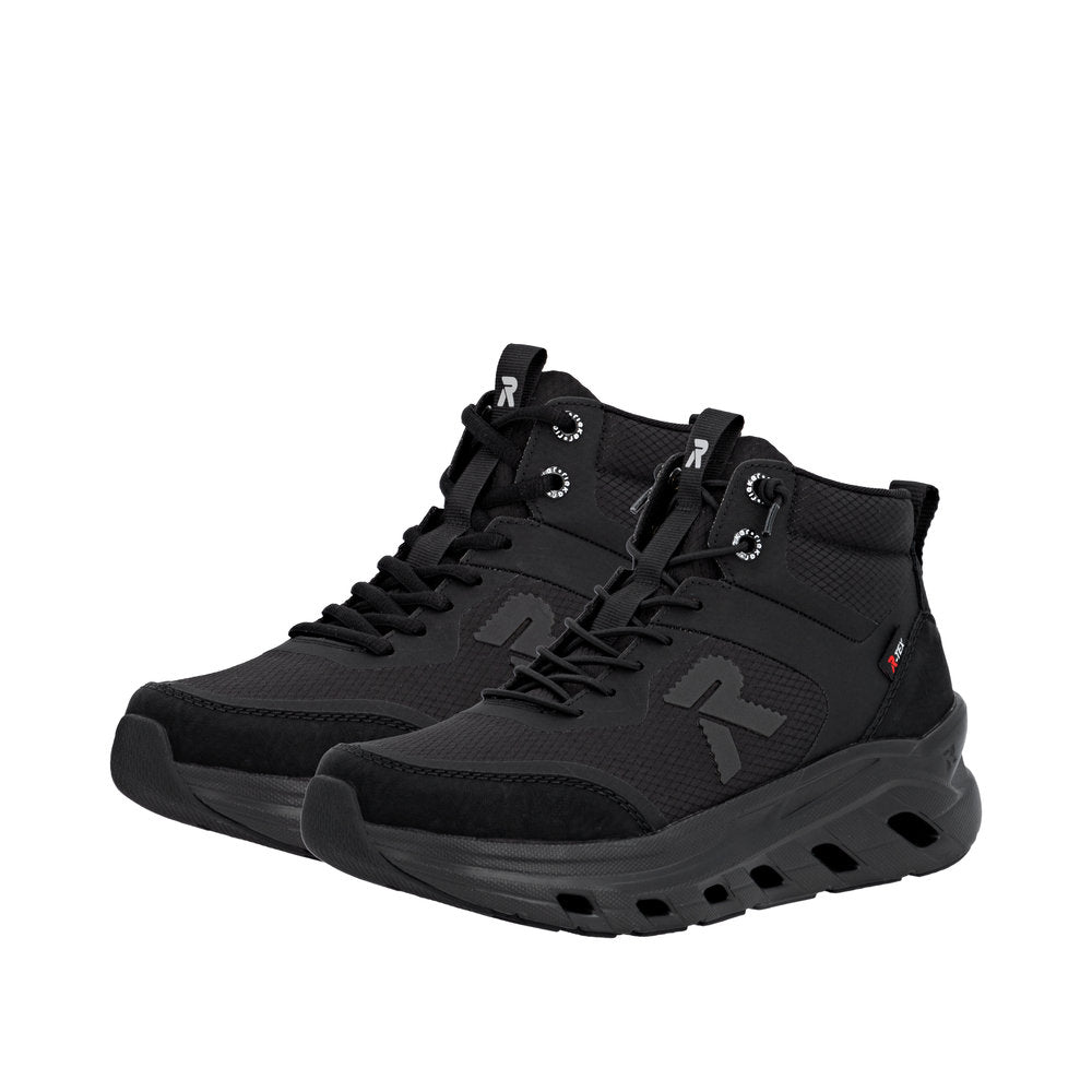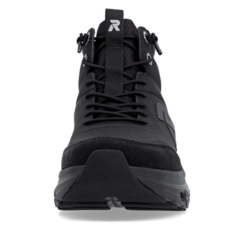 Baskets montantes Rieker noires en textile de qualité. Marche protégée : ce modèle est équipé d'une membrane RiekerTEX déperlante et respirante. Le revêtement HighTech Nano assure une protection contre l'eau et la saleté. Déroulement dynamique du talon aux orteils grâce à la semelle intérieure MemoCup rembourrée et amovible. Doublure en laine vierge très chaude pour une protection durable contre le froid. La largeur confortable assure un ajustement parfait. Une paire de lacets de rechange est incluse.