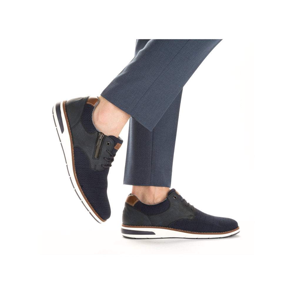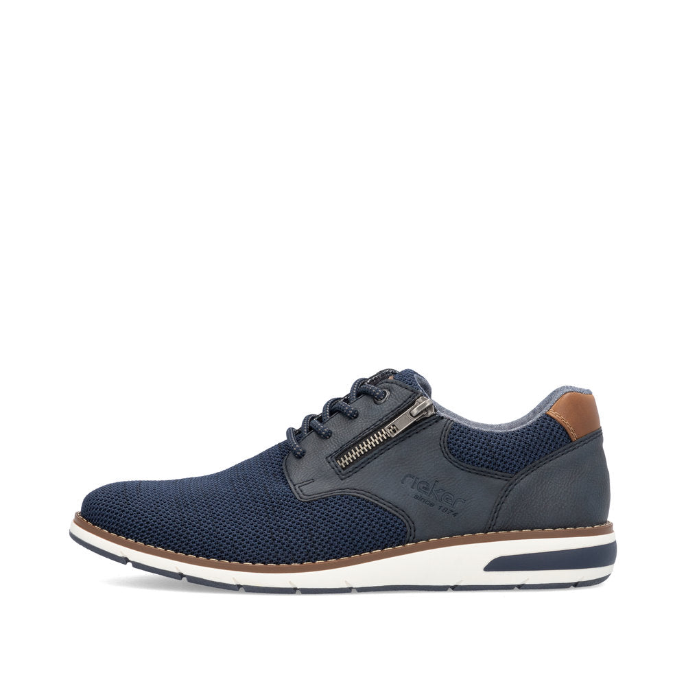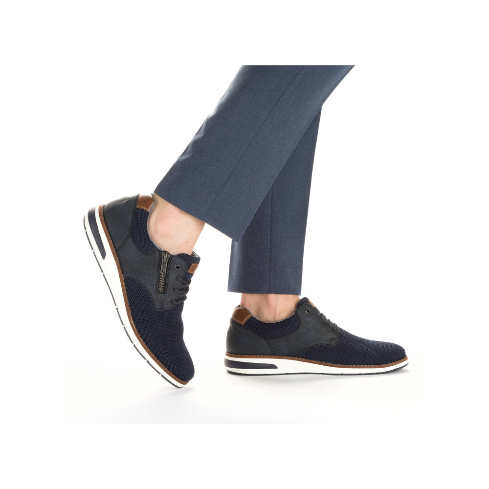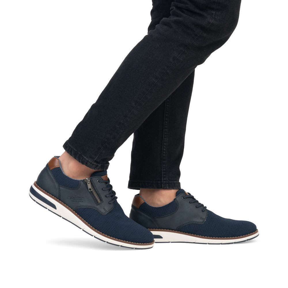 Comfortable and good-looking - it works! These blue Rieker lace-up shoes impress with their modern design and high comfort. The lacing complements the zipper and thus guarantees optimal support and perfect fit. The shoe has a grippy sole that offers good traction for a secure step. In addition, the cover sole is extra soft. Thanks to the comfort width G 1/2, there is enough space in the forefoot area. More is not possible!