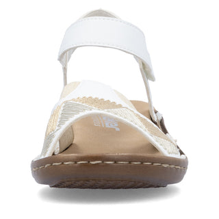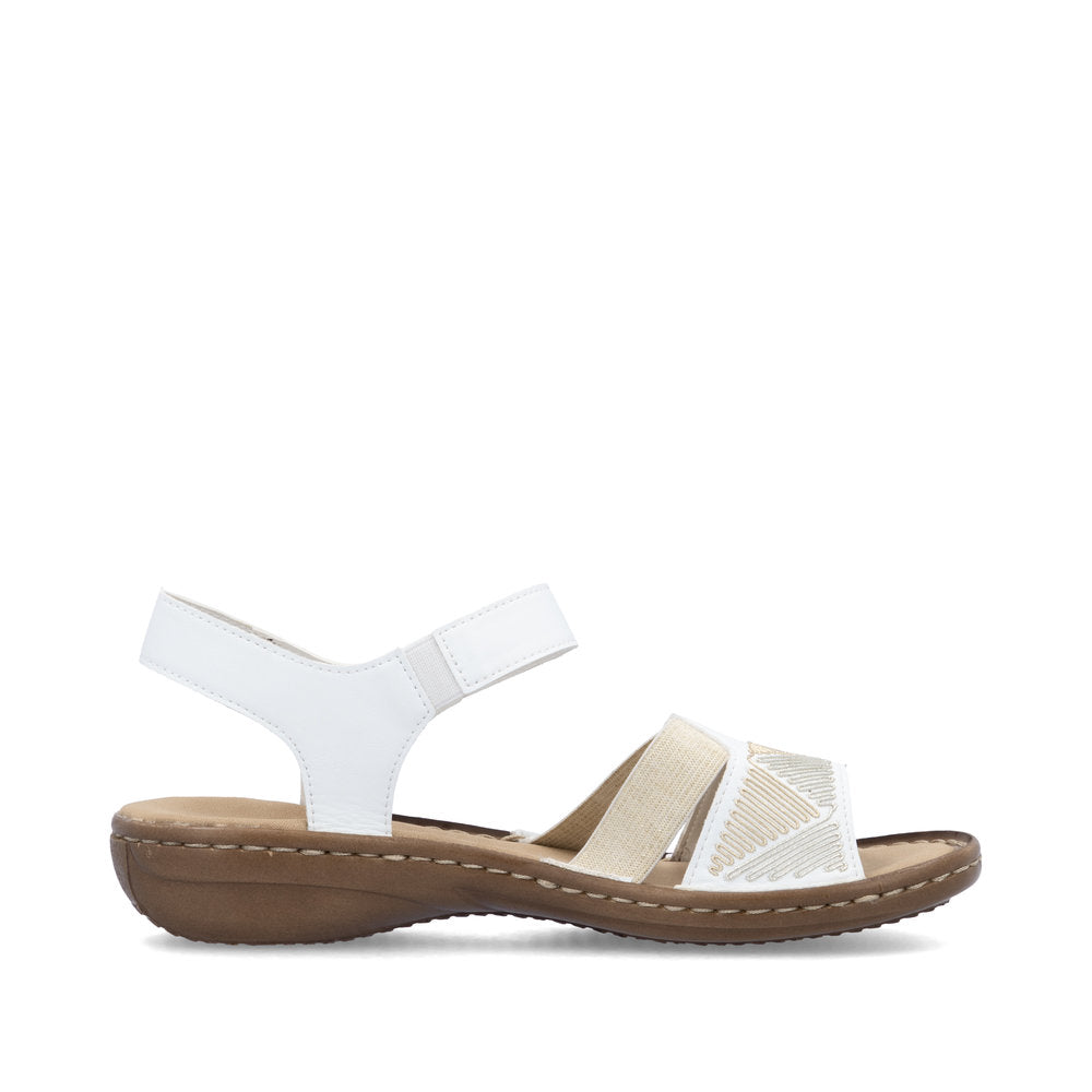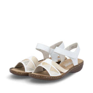 Attention, favourite shoe potential! These white Rieker strap sandals guarantee a heavenly feeling. This shoe was made using the traditional stitchdown technique, which gives it a high degree of robustness and flexibility. The hook and loop fastener allows for a quick entry and keeps the shoe perfectly on the foot. The middle strap with high-quality decorative elements effectively freshens up the design. With the shock-absorbing and light sole with wedge heel, your feet will be pampered at every step. The narrow fit E 1/2 gives the foot good support in the shoe. Summer is on!