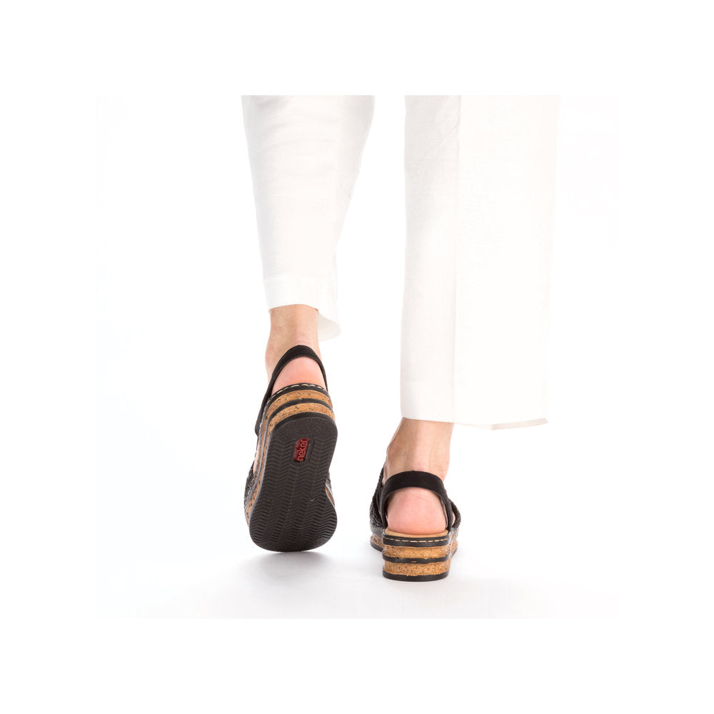 Style and comfort - best friends forever! You won't want to take off these black Rieker wedge sandals. The shoe is constructed in the stitchdown style, which makes it particularly robust and flexible. The elastic bands also ensure that the shoe fits at all times. The light and shock-absorbing sole with wedge heel ensures a pleasant wearing sensation. The cover sole is also extra soft. Thanks to the narrow E 1/2 fit, the shoe fits comfortably tight without pinching. A nice side effect: you're a few centimetres taller!