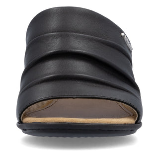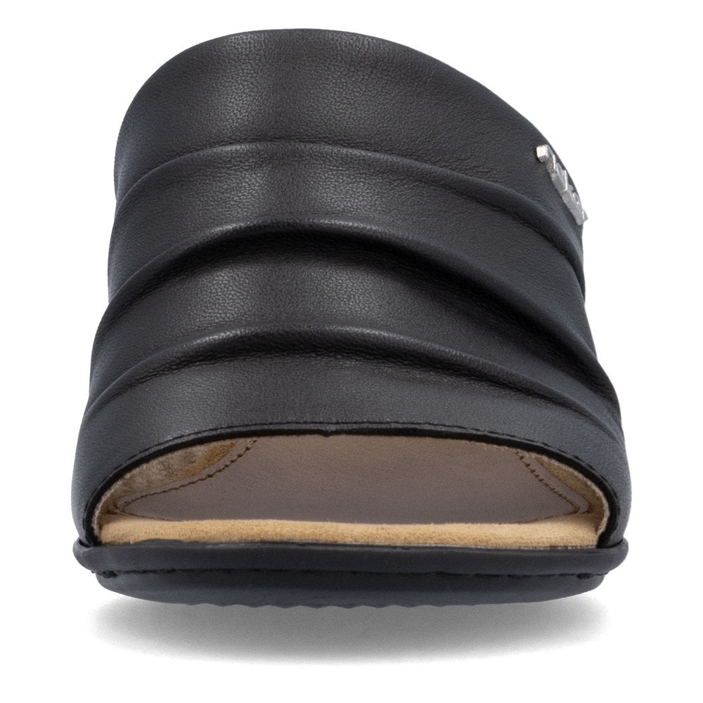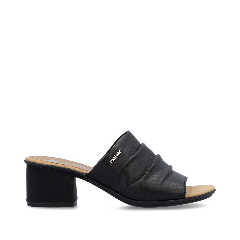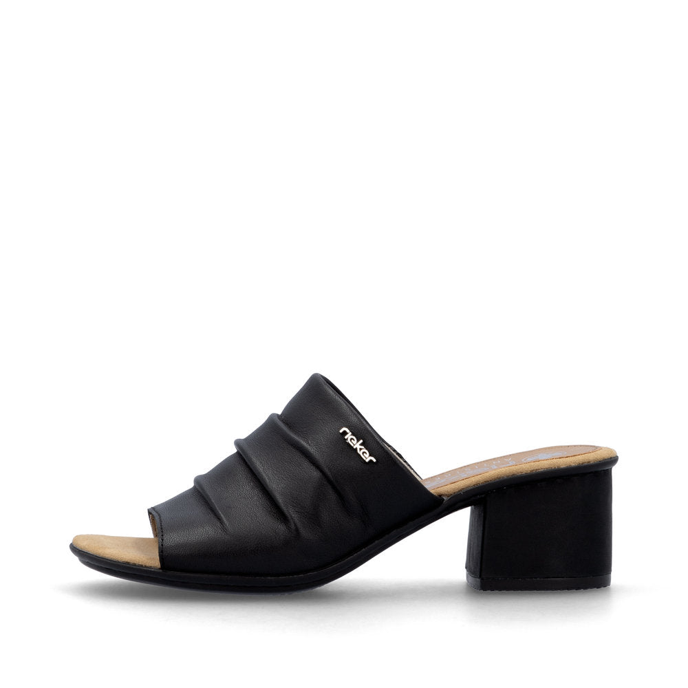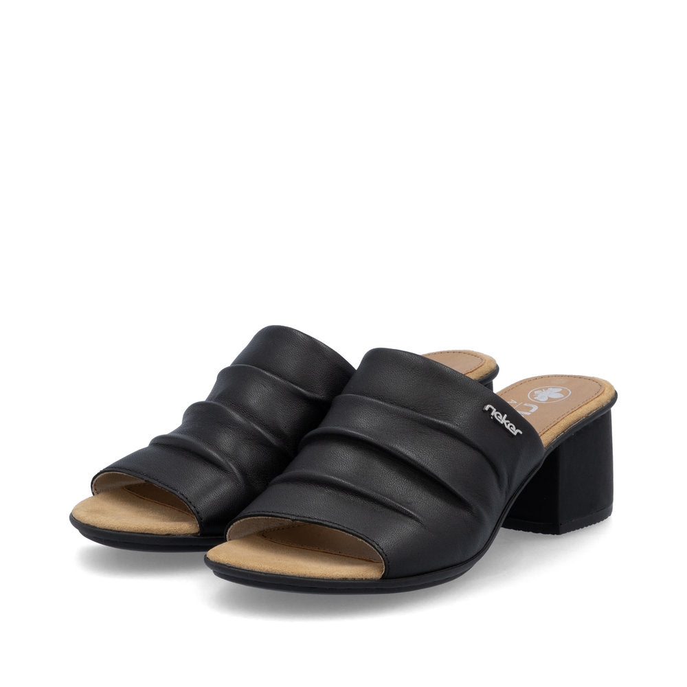 Walking on Sunshine - at least that's how it feels. These black Rieker mules made of smooth leather guarantee a heavenly feeling. Thanks to the stitched construction, the shoe is particularly stable and offers a flexible sole that adapts harmoniously to the foot. The shoe can be put on by simply slipping it on without a fastener. With the shock-absorbing and light sole with block heel, a cushioned walking experience is the new standard. Your best buddies for the new season!