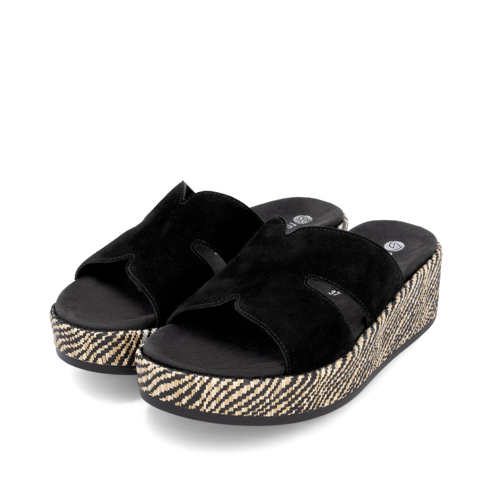 With style and comfort through the summer! These comfortable black remonte mules made of suede leather impress with a cool look and functional power. The elastic band makes it easy and comfortable to put on and take off the shoe. The Lite 'n Soft technology with its ultra-soft sole and soft and removable insole ensures a comfortable feeling. For large feet, the shoe is available up to size 45. You can't get more style than this!