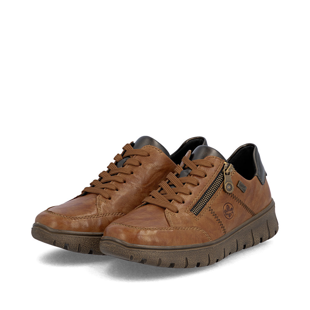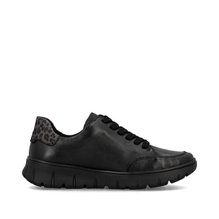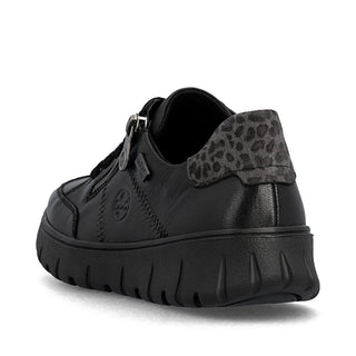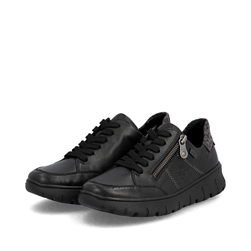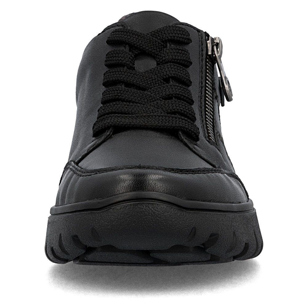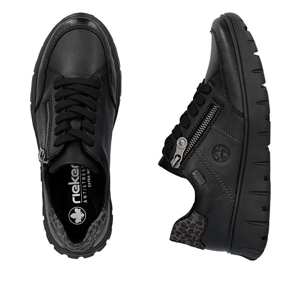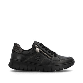 All-time favourite! You won't want to take these black Rieker lace-up shoes made of smooth leather off. The clever combination of lacing and zipper guarantees a perfect fit and optimal support. The sole is both ultra light and shock-absorbing, offering a double sense of well-being at every step. With the padded and removable insole, the shoes have another practical comfort feature. The extra width offers enough space for the feet to feel comfortable even when worn for longer periods. Thanks to the water-repellent RiekerTEX membrane, the best comfort is ensured even on wet and cold days. Well-being included!