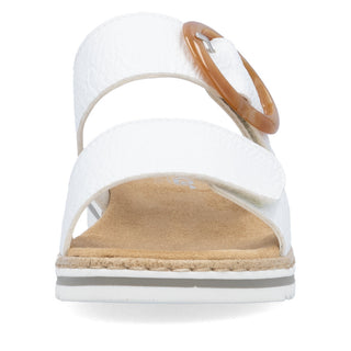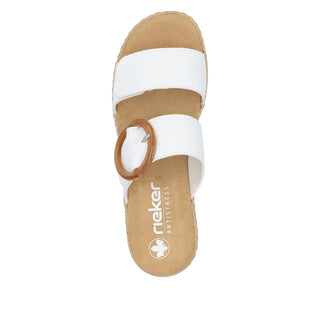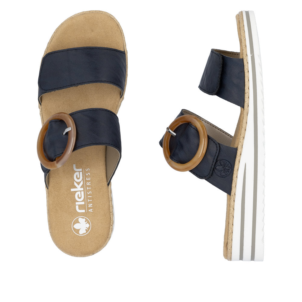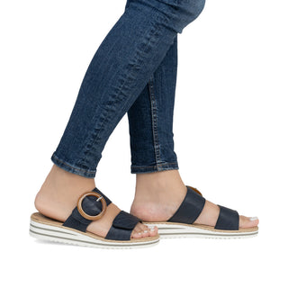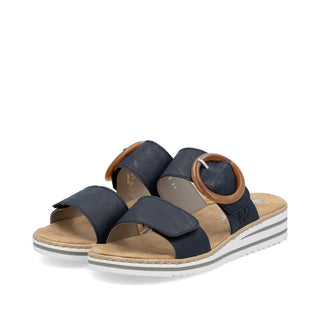 Attention, favourite shoe potential! You won't want to take off these blue Rieker mules. The traditional stitchdown construction makes the shoe particularly flexible and robust and ensures a great fit. The mules are put on in no time thanks to a double hook and loop fastener. The trendy buckle is a real eye-catcher. The shock-absorbing and light sole with wedge heel provides a pleasant, cushioned feeling at every step and the cover sole is extra soft. Extra support is provided by the slim fit E 1/2. Enjoy the summer!