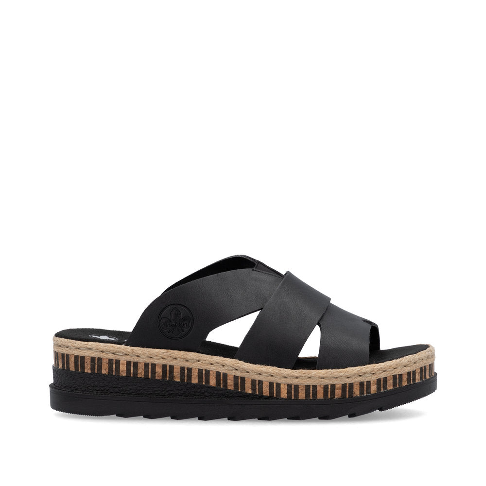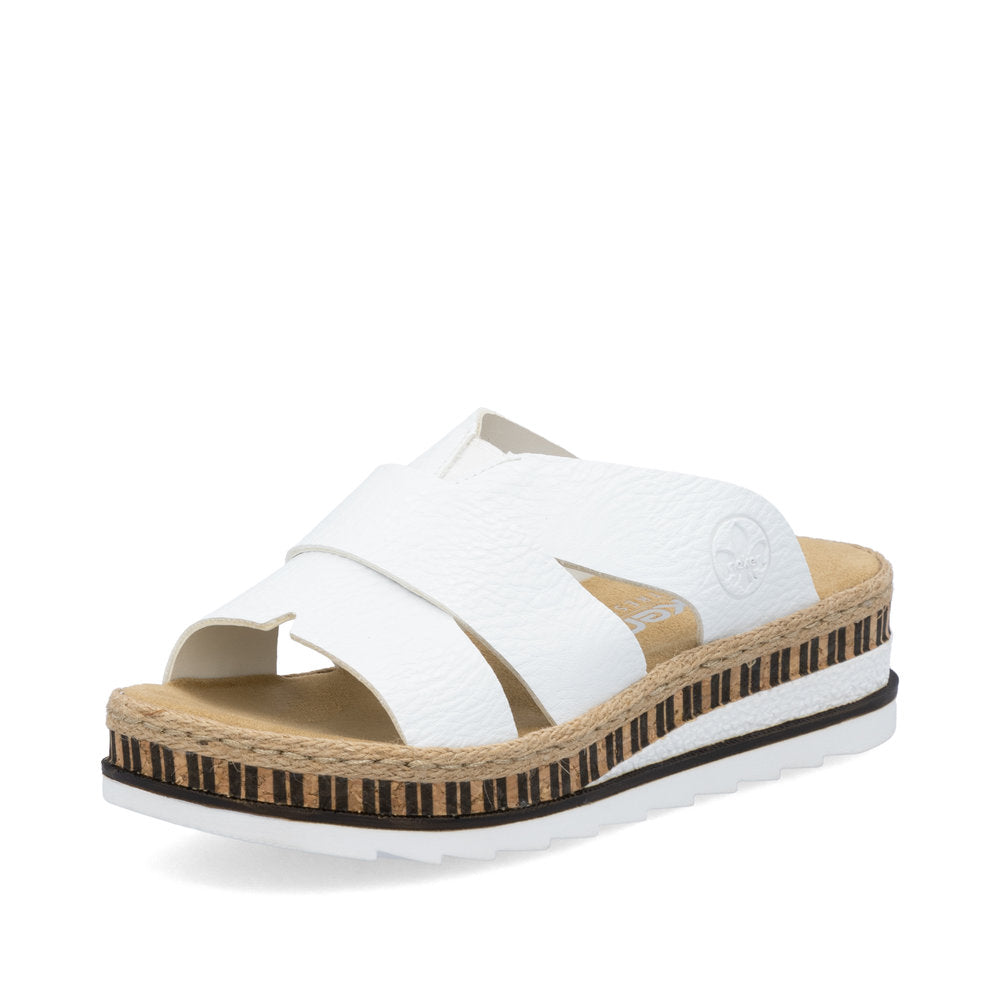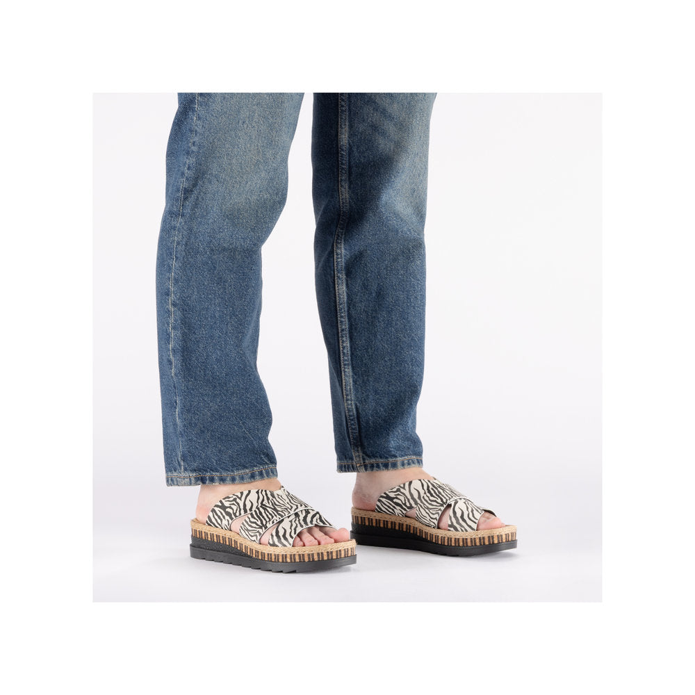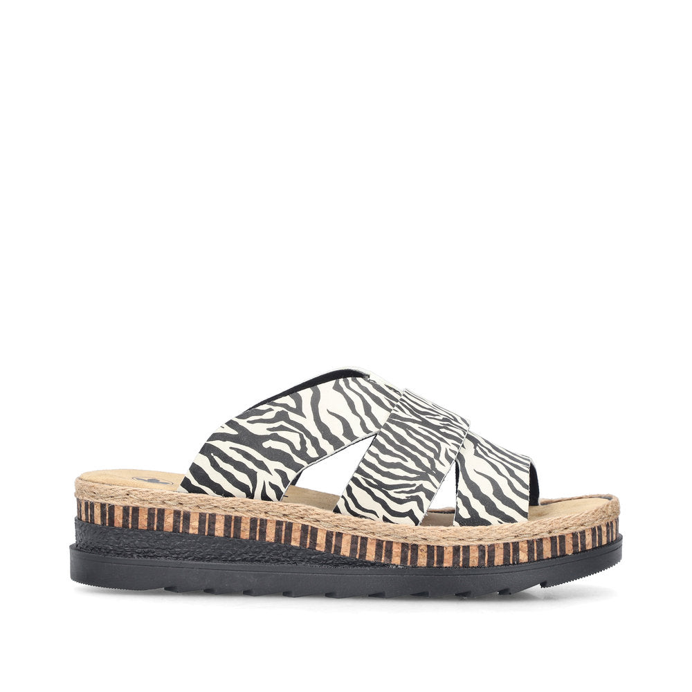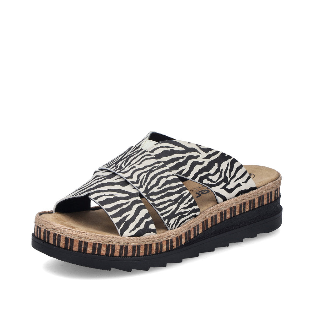 All-time favourite! These black-white Rieker mules are guaranteed to get you in the summer mood. The stitchdown construction makes this shoe a particularly durable and flexible companion. An elastic band is a great simplification especially when putting on and taking off the shoe. The fashionable animal print gives the shoe that certain something. The very light and shock-absorbing sole with wedge heel ensures a cushioned walking experience. In addition, the cover sole is extra soft. Moreover, the narrow fit provides extra support. Attention, potential favourite shoes.