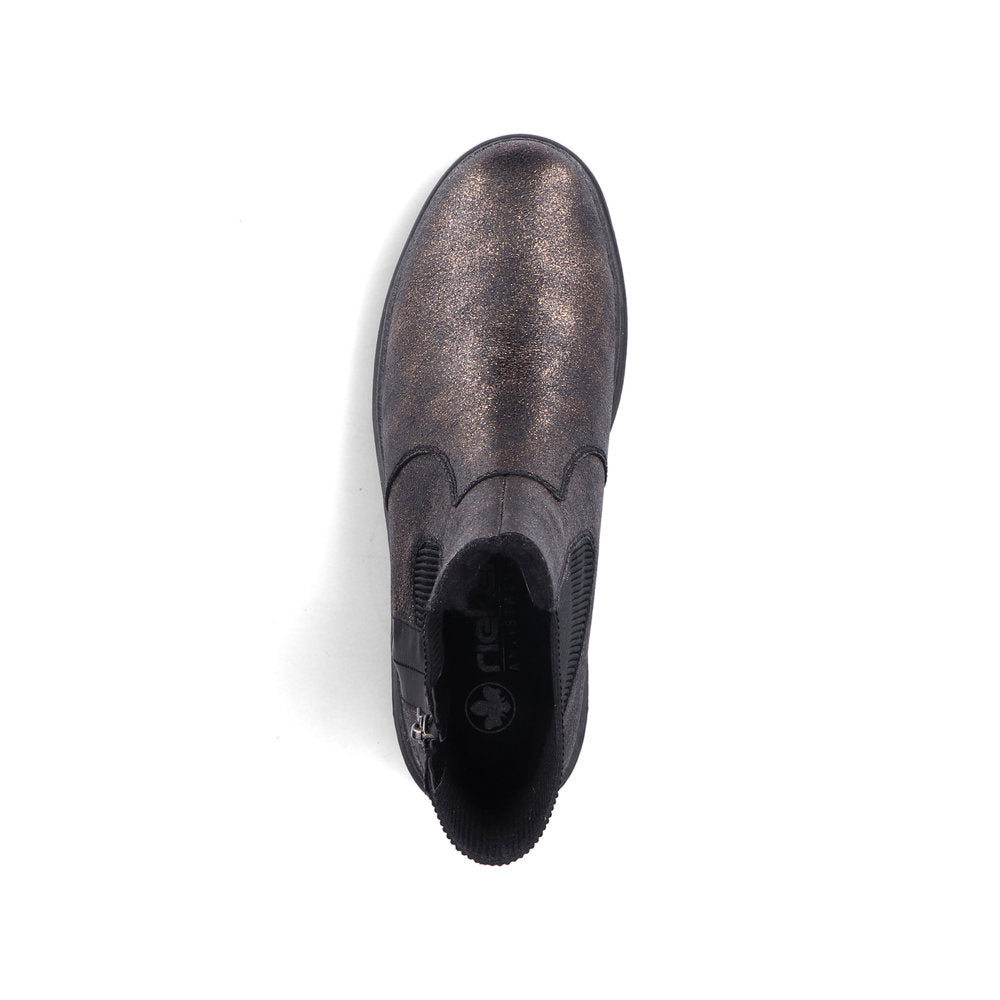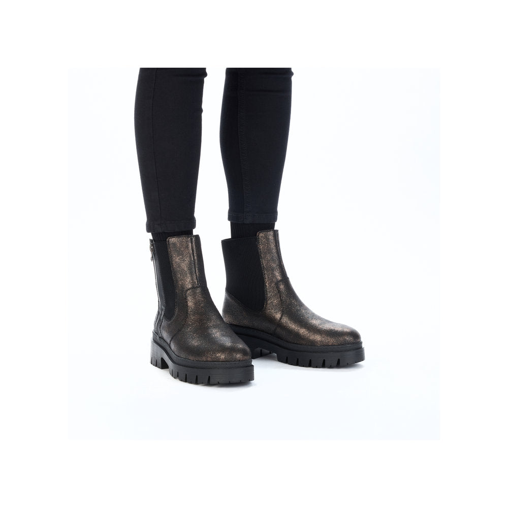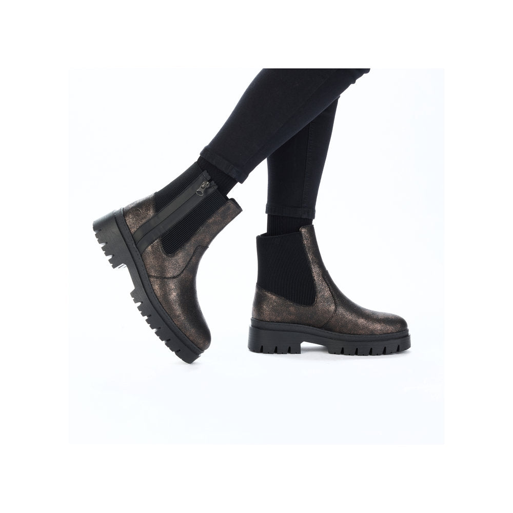 Never cold feet again! You'll be cool and casual on the move in these bronze Rieker Chelsea boots. In addition to the zipper, the model has an elastic insert, making it twice as easy to put it on. The grippy sole provides sure-footedness. Thanks to the padded and removable insole, optimal comfort is a given. With the soft warm lining, the shoes are perfectly equipped for cold temperatures. More is not possible!